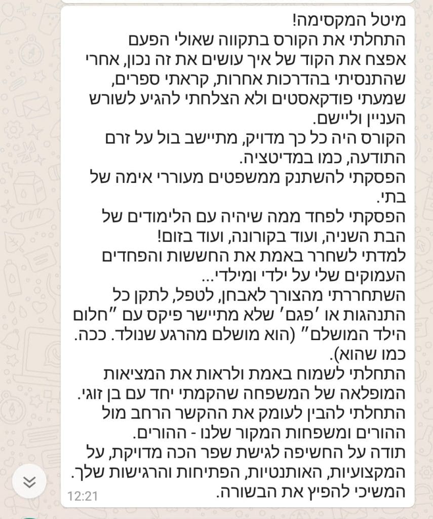 הבא"ככל שמעמיקים בגישה הזו רק מגלים עוד ועוד ואני מקווה שכולם יזכו להיחשף לתכנים האלה ולהדרכה שלך"הבא