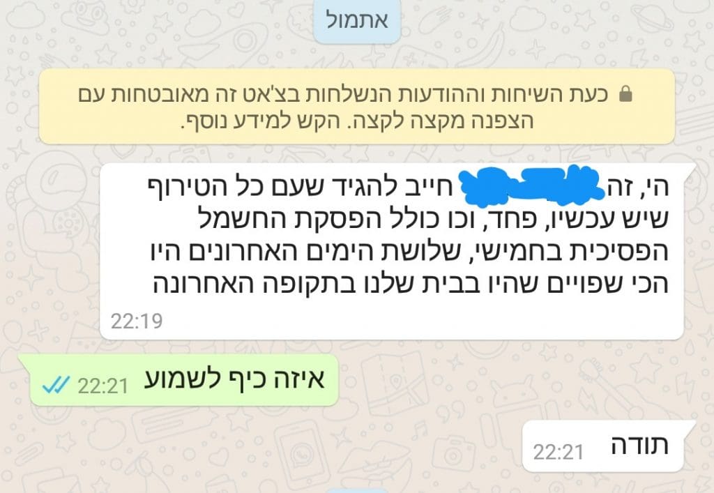 "חייב להגיד שעם כל הטירוף שיש עכשיו, פחד, וכו כולל הפסקת החשמל הפסיכית בחמישי, שלושת הימים האחרונים היו הכי שפויים בבית שלנו בתקופה האחרונה"