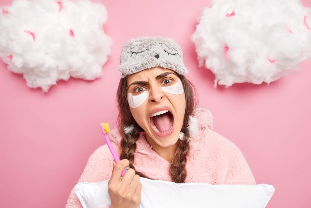 Emotional woman with two pigtails exclaims loudly holds toothbrush going to brush teeth after awakening dressed in pajama isolated over pink background. Sleeping morning routine and hygiene.